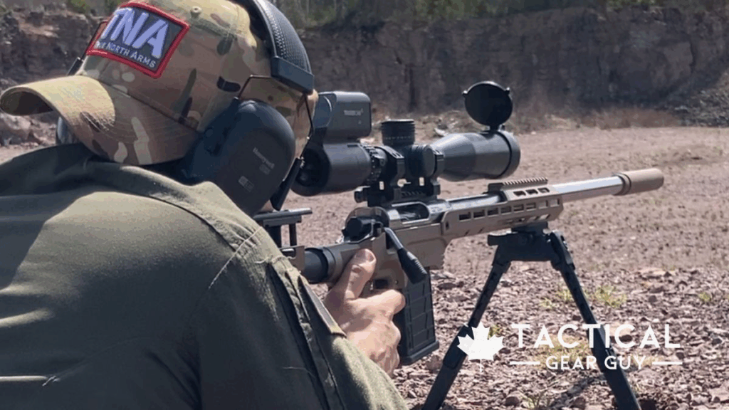The scope is made by a Canadian optics company, Scorpion Outdoors, and the specific optic I’m using is the Target Master Wildcat 6-24×50 TAC FFP, and I’ve been super impressed with it. The glass is great, excellent field of view, and has an illuminated reticle. If you’re looking for a Canadian-made affordable optic, then check out Scorpion Outdoors.