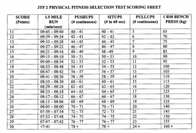 Applicants for becoming a Special Forces Operator must be able to perform the following standards for each test and achieve a total accumulative score of a minimum of 75 points.